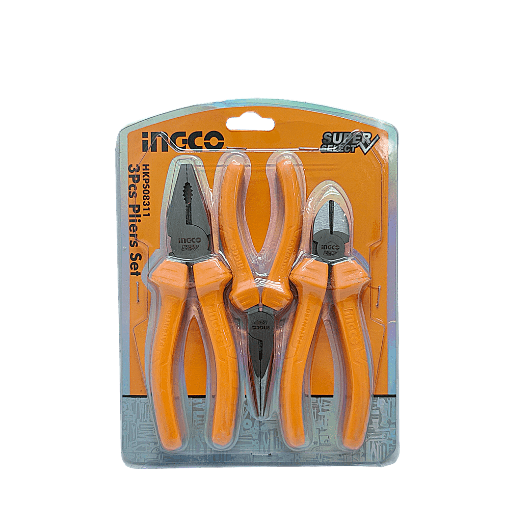 El set de alicates INGCO HKPS08311 reúne tres herramientas manuales esenciales para cualquier caja de herramientas profesional o de bricolaje doméstico. Incluye: un alicate universal de 7″ (180 mm) para agarre y sujeción general, un alicate de punta larga de 6″ (160 mm) ideal para trabajos de precisión y acceso en espacios reducidos, y un alicate de corte diagonal de 6″ (160 mm) especializado en cortar alambres, cables o componentes metálicos finos.