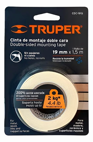 La Cinta de Montaje Truper de 19 mm x 1,5 metros es una solución práctica y resistente para fijaciones rápidas sin necesidad de tornillos, clavos o perforaciones. Está diseñada para ofrecer una adhesión fuerte y duradera, permitiendo montar y sujetar diversos objetos de forma limpia y segura.