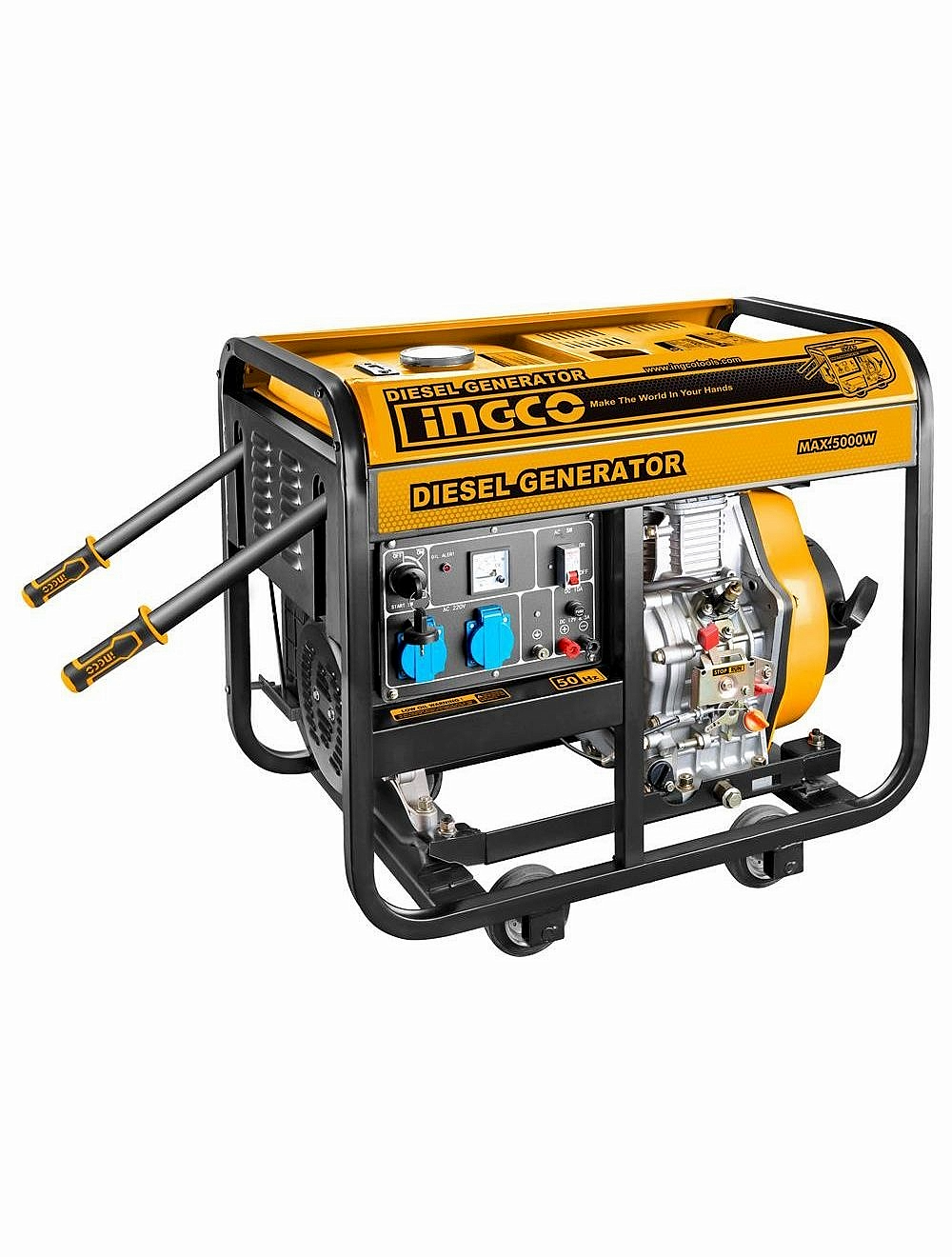 Generador diésel INGCO GDE50001 5 kW: motor 9 HP diésel, 220-240 V, arranque eléctrico + retroceso, tanque ~15-16 L, ruedas incorporadas. Ideal para respaldo e industria ligera.