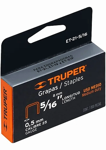 Grapas Truper 5/16″ (8 mm) ET-21. Fijación firme, acero resistente y pack de 1000 unidades.