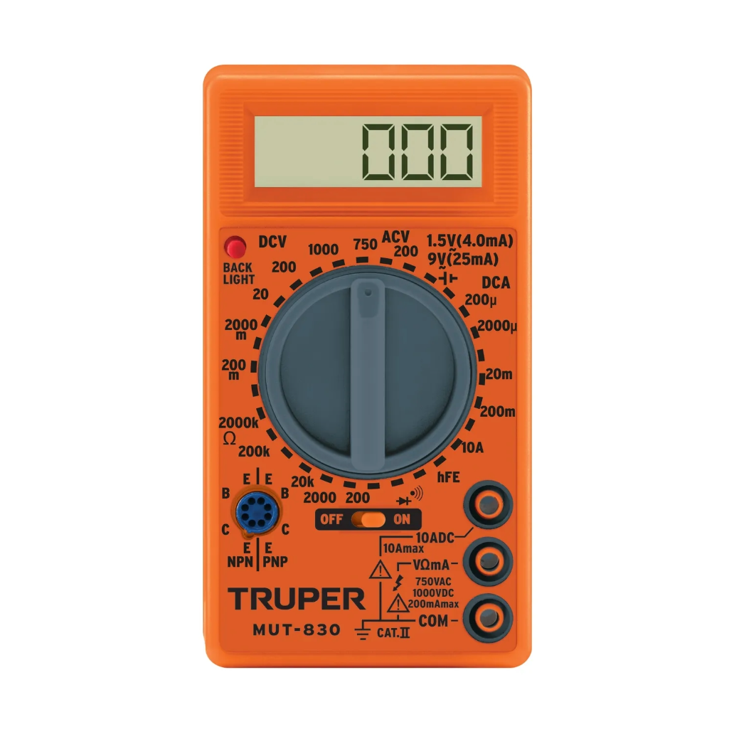 El multímetro digital Truper MUT-830 es una herramienta práctica y confiable para mediciones eléctricas básicas en trabajos de electricidad, electrónica y mantenimiento general. Permite medir voltaje, corriente y resistencia de forma precisa, siendo ideal tanto para técnicos como para usuarios domésticos.
