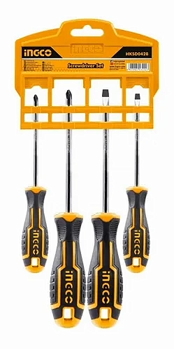 El juego de destornilladores INGCO modelo HKSD0428 incluye 4 piezas esenciales cubriendo los tipos de punta plana (SL) y cruzada (PH), siendo una excelente solución tanto para profesionales como para aficionados del bricolaje que requieren versatilidad en atornillado y desmontaje.