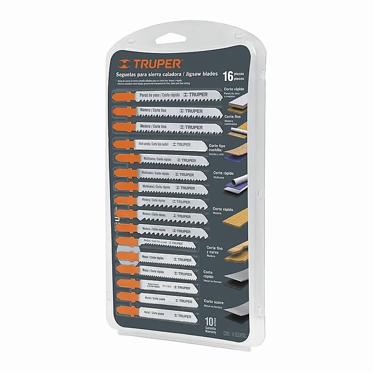 Set de hojas para sierra caladora Truper 16 unidades. Cortes precisos en madera, metal y multiuso.