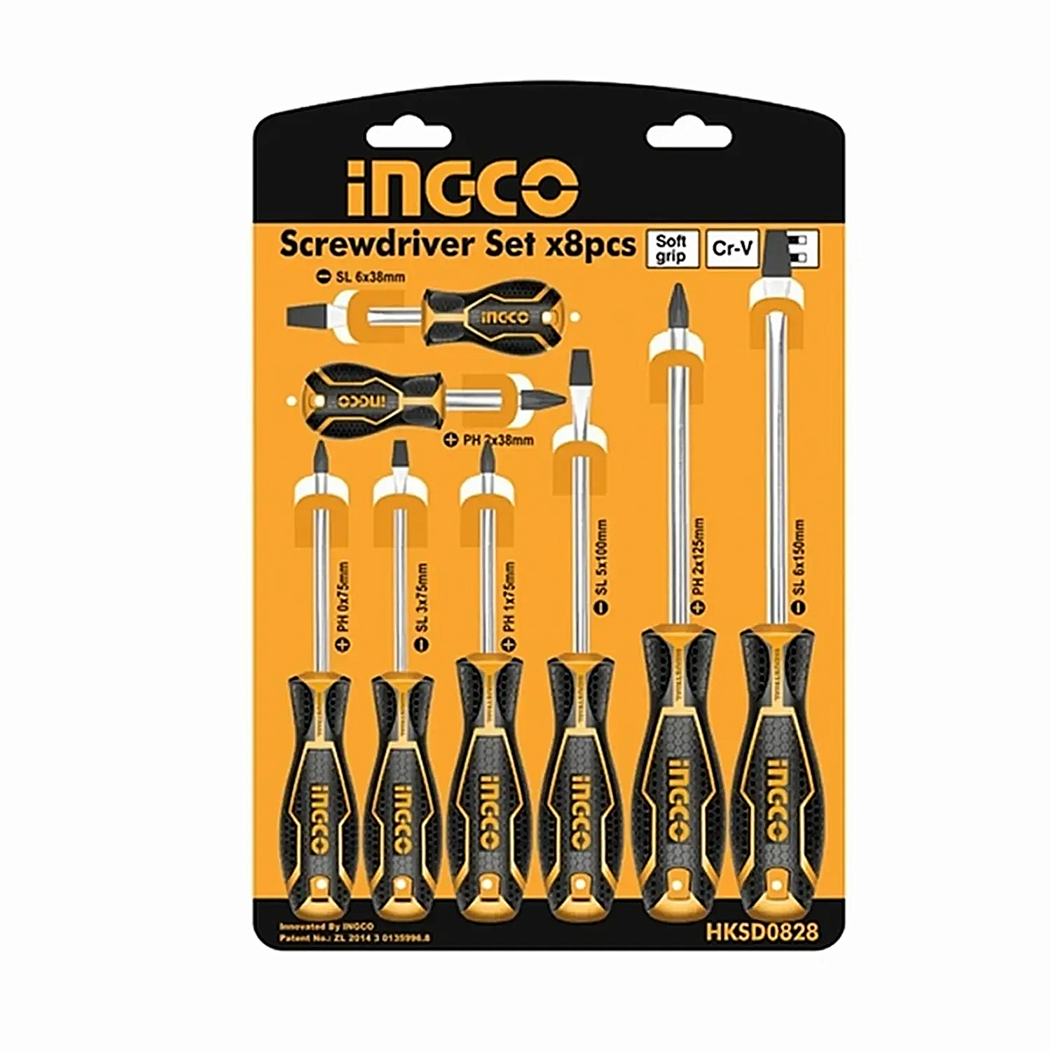 El set de destornilladores INGCO modelo HKSD0828 consta de 8 piezas esenciales, diseñado para cubrir tanto puntas planas (SL) como Phillips (PH), y abarca varias medidas de longitud y diámetro para múltiples aplicaciones de montaje, mantenimiento, electricidad ligera y bricolaje.