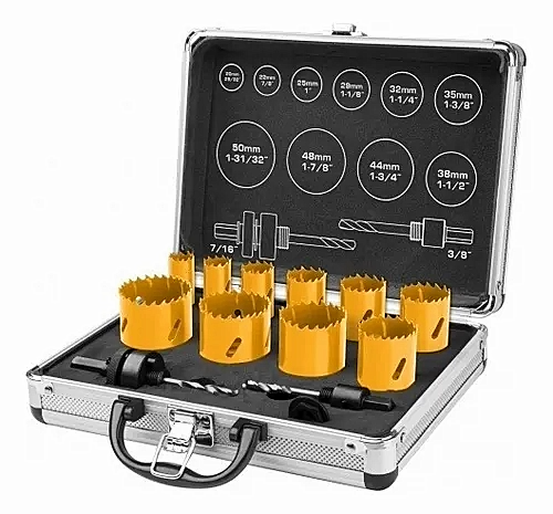 El set incluye además dos arbors versátiles que permiten adaptar las sierras a diferentes diámetros, facilitando su uso con taladros y herramientas compatibles. Todos los componentes vienen organizados en un estuche de aluminio resistente, lo que facilita el almacenamiento y transporte.