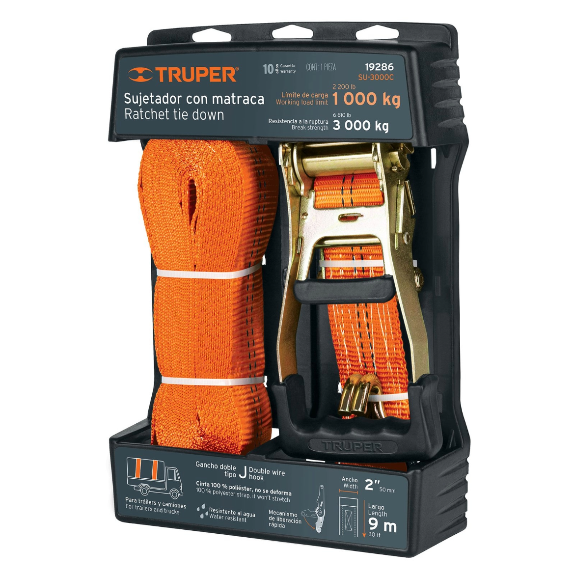 Sujetador con matraca Truper 3000 kg 9 m. Máxima resistencia y seguridad para cargas pesadas.